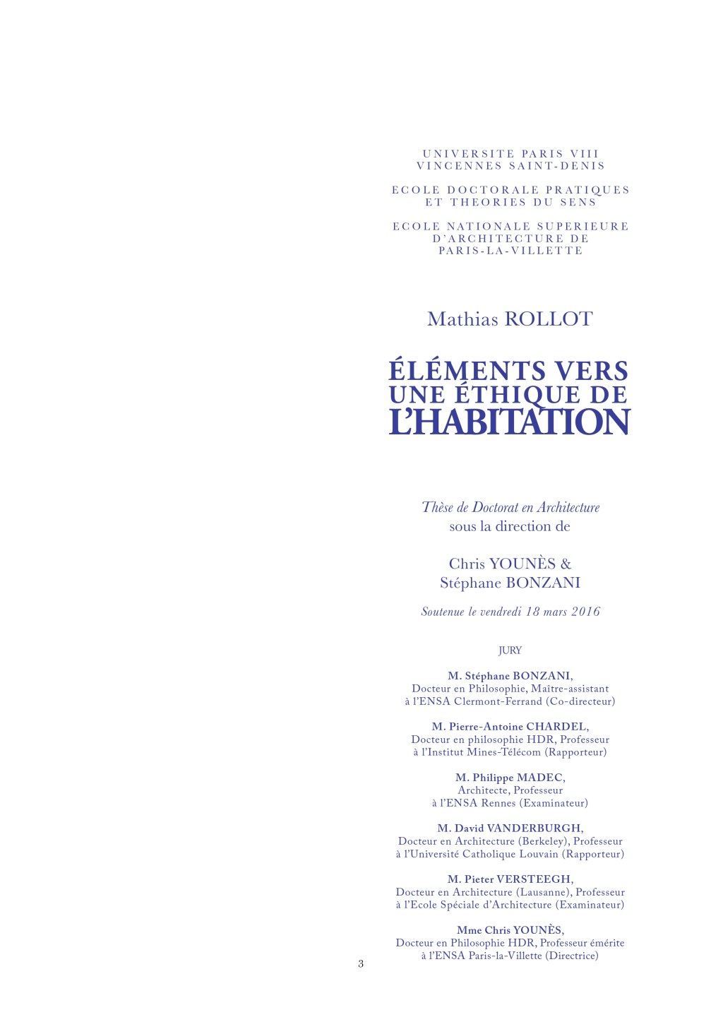 Elements vers une éthique de l’habitation est une thèse de doctorat en architecture à l’Université Paris 8 (ENSAPLV/GERPHAU), sous la direction de Chris Younès et de Stéphane Bonzani, soutenue le 18 mars 2016 à Paris.