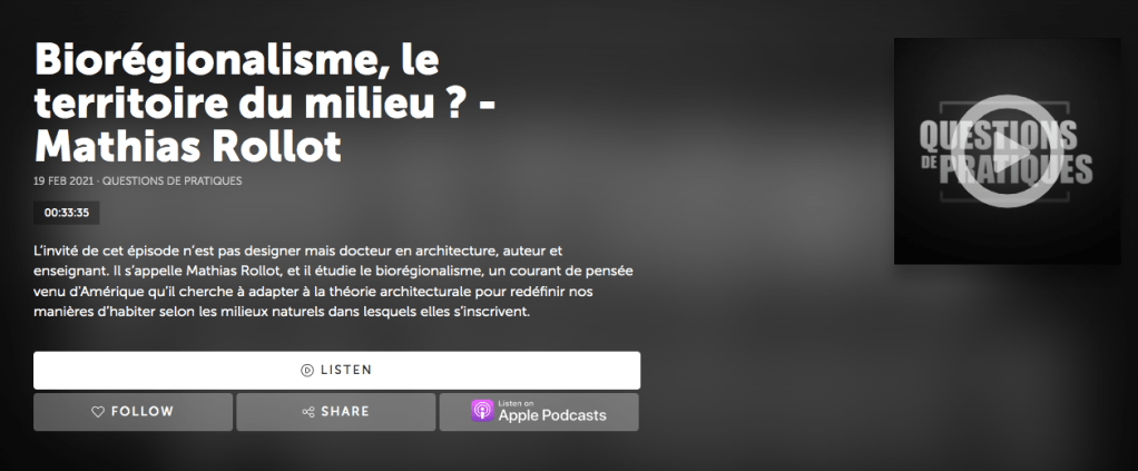 « Comment habiter le monde ensemble, aujourd’hui ? C’est la question avec laquelle je suis allée à la rencontre de Mathias Rollot. Mathias Rollot est architecte, enseignant, chercheur.et auteur. Dans cet épisode, Mathias nous explique comment nous pouvons bâtir une architecture utile au monde, une architecture que tout le monde peut s’approprier. – Une architecture biorégionale au sens où elle est pensée, créée, tissée avec ceux qui sont là au même endroit au même moment. – Une architecture biorégionale en ce sens qu’elle est pensée depuis la nature, en tentant de tenir compte de son point de vue et pas seulement de l’intérêt des humains. – C’est une architecture qui tente de se défaire de l’anthropocentrisme : une écologie locale, populaire, située dans un lieu, consciente de son impact sur le milieu, du type de sol, du climat, des pollutions présentes… Il s’agit de devenir « autochtone », c’est-à-dire, concrètement, d’être de la terre qu’on habite, d’appartenir à ce territoire, sur une terre qui peut changer, se transformer, devenir. Mathias Rollot nous parle aussi, ici, d’une architecture décolonisée, en ce sens qu’elle sort de la grande logique de la domination. C’est une architecture utile, fertile, qui permet d’habiter le monde ensemble… » (depuis la page du podcast Entrelacs).